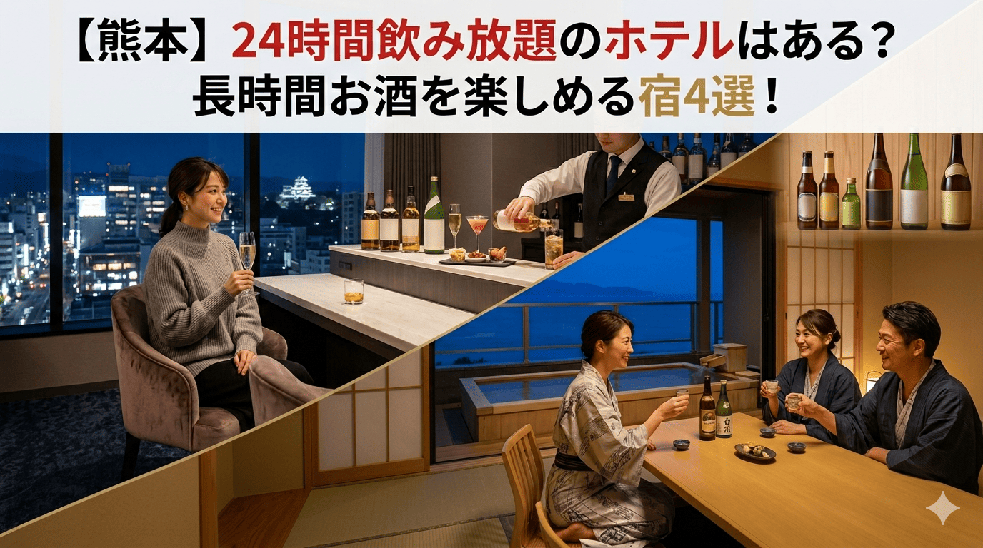 | スーパーホテルグループ(熊本駅前等) | 夕方のウェルカムバーで数時間飲み放題 | コスパ最強。地酒やリキュールが無料で、食事の持ち込みも自由。 |